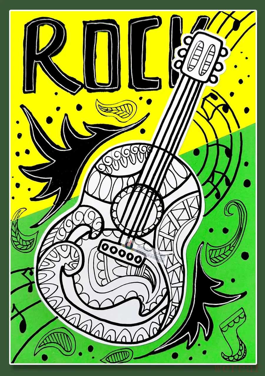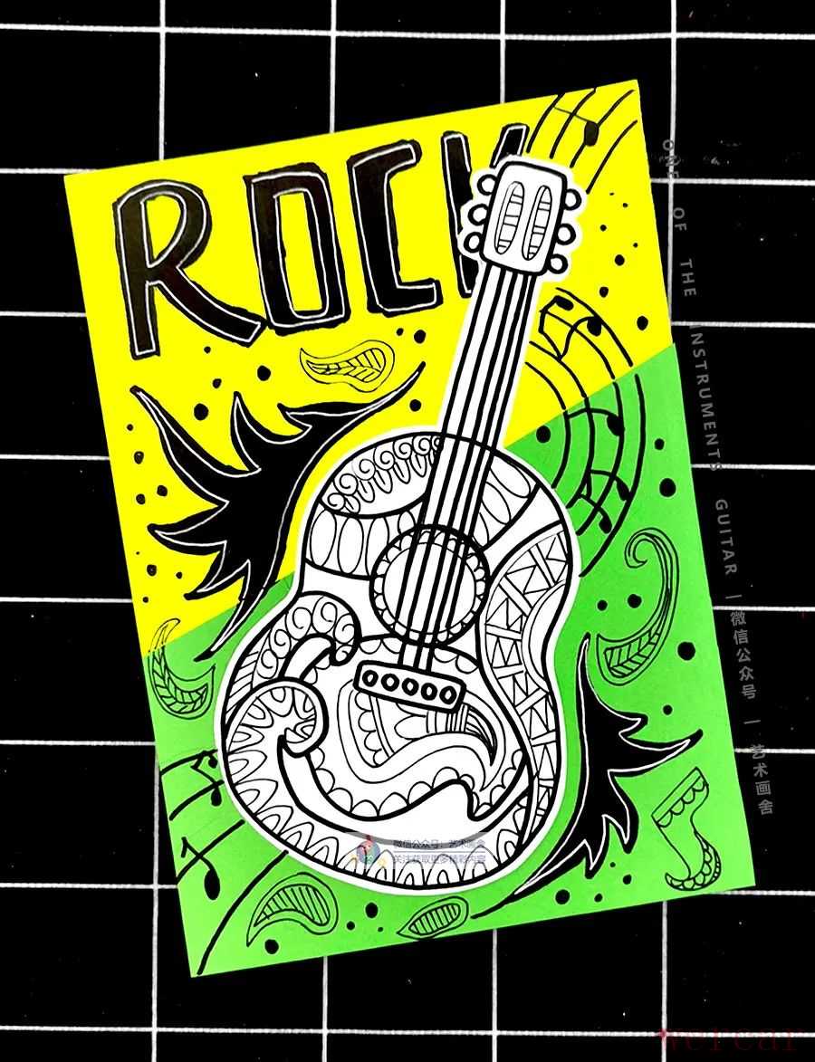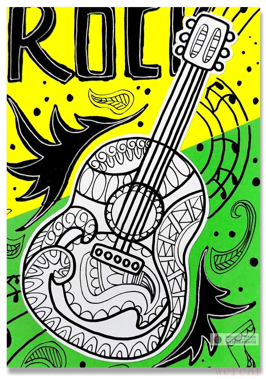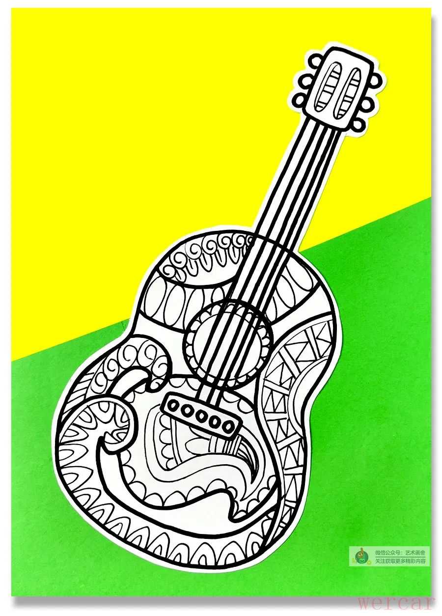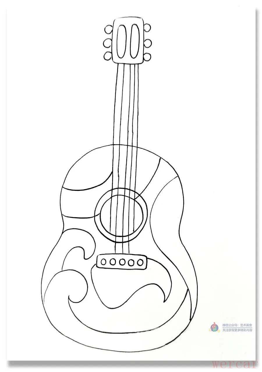 2.在白色的卡纸上画出吉他的外形,并用不同的线条表现出吉他的结构特点。