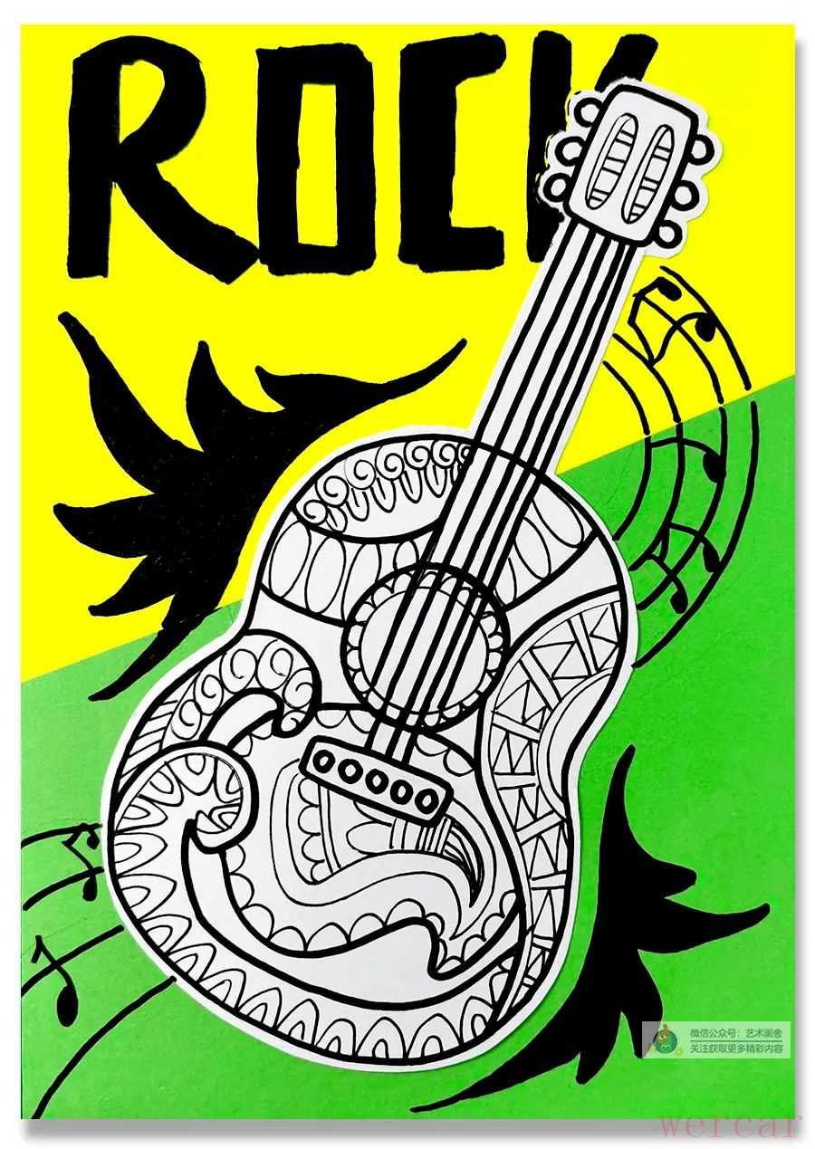 1.在课程中,我们用剪贴、线描的手法描绘一把独一无二的吉他,培养了小朋友们观察生活、发现并表现美的能力,锻炼了小朋友们的塑造能力、线条组织能力和想象力。2.在创作中,小朋友们通过欣赏、观察,在画面中表现出不同的吉他外形,每个小朋友笔下的吉他富有特点、线条丰富生动,充满了装饰美感;在背景上,通过剪贴和线条进行装饰,使画面更加生动,突出主体视觉感。