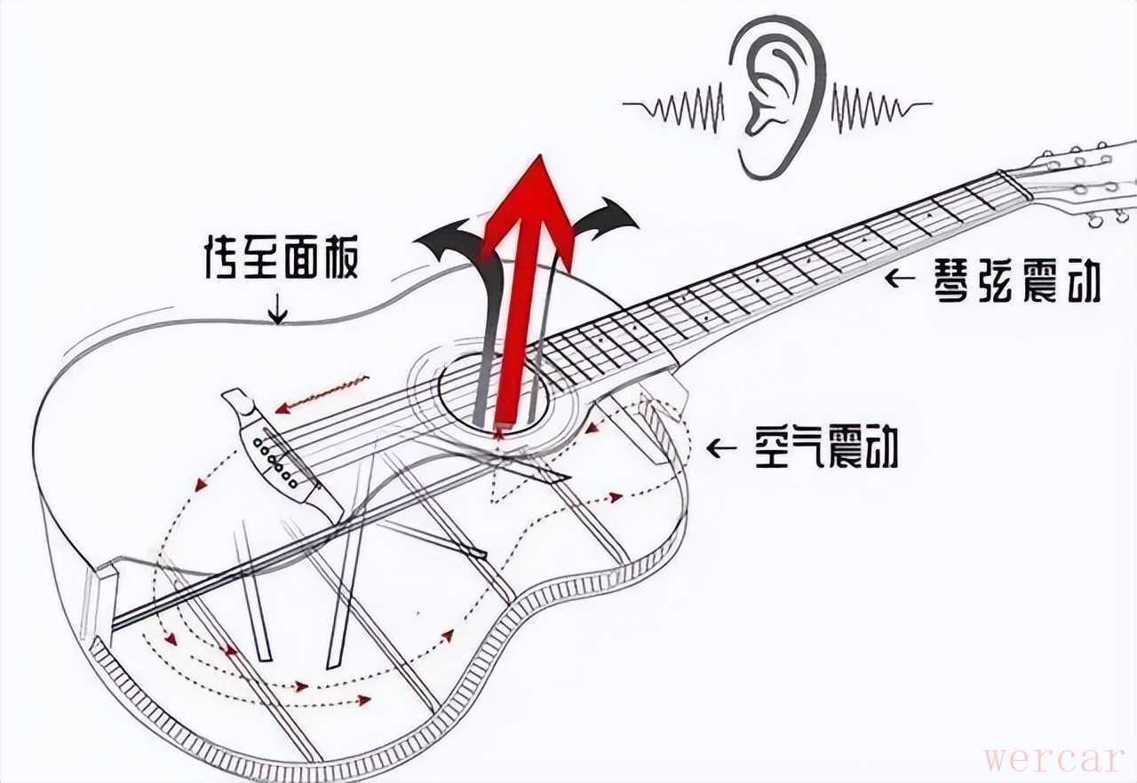 当弹奏吉他时,琴弦的振动传递到面板上,面板跟着琴弦振动,从而推动空气振动,进一步放大琴弦振动,使我们听到琴弦的声音。面板的作用就在于通过空气传导琴弦的实时动态。