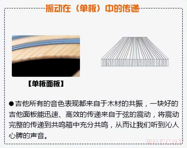 而面板则不同,面板是吉他共鸣的发源地,起到扩散琴声、加强共鸣和均衡琴弦拉力的作用。