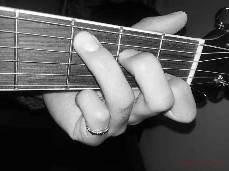 要是没有音阶图,怎么用F指型按出C和弦?先记住F和弦的根音是六弦一品的F,再根据“全全半全全半”的音程关系推导:从F往后挪一个全音是G,再挪一个全音是A,再挪一个全音是B,最后挪一个半音就是C。所以把F和弦的指型移到对应位置按大横按,就是C和弦的按法。