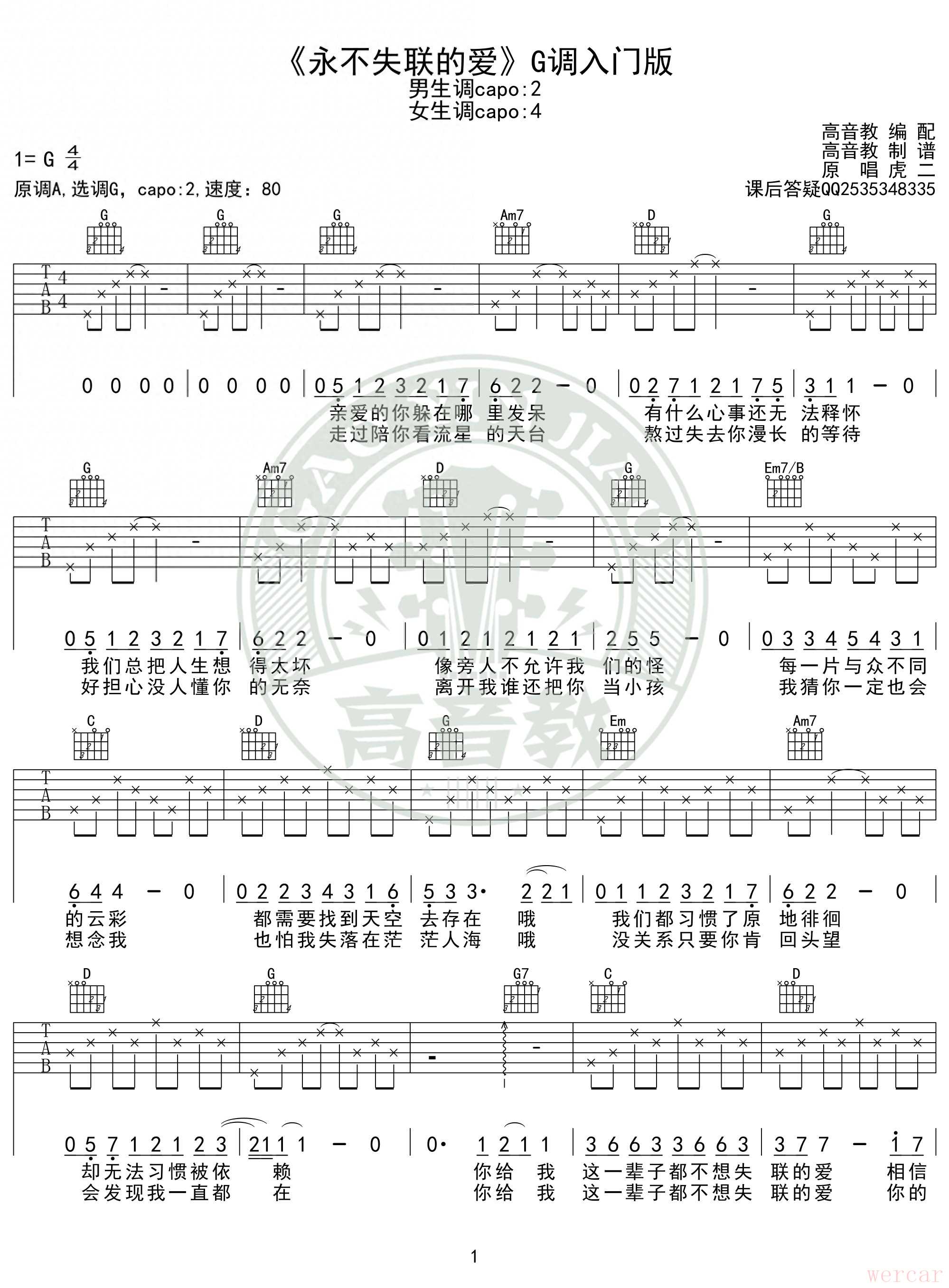 以下是为您提供的《永不失联的爱》吉他谱G调入门版,高音教编配,猴哥吉他教学风格: