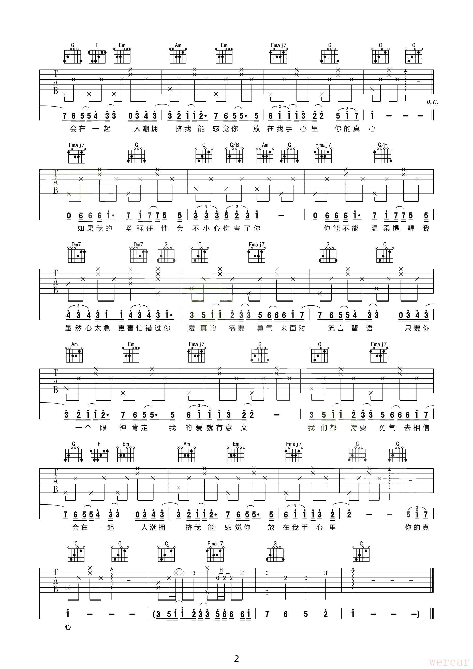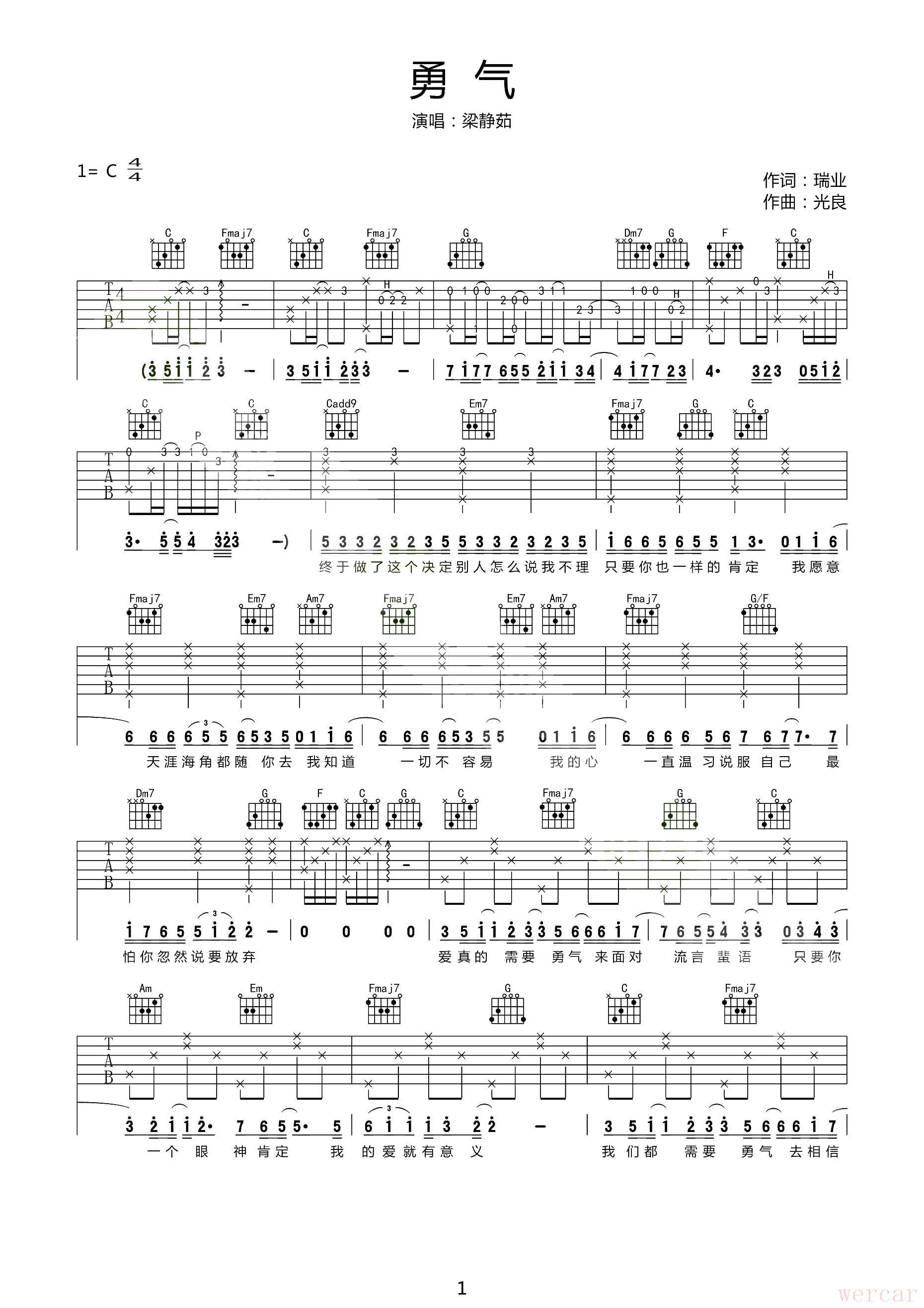 这是梁静茹《勇气》的吉他谱,采用最常用的 C 调和简单的和弦。