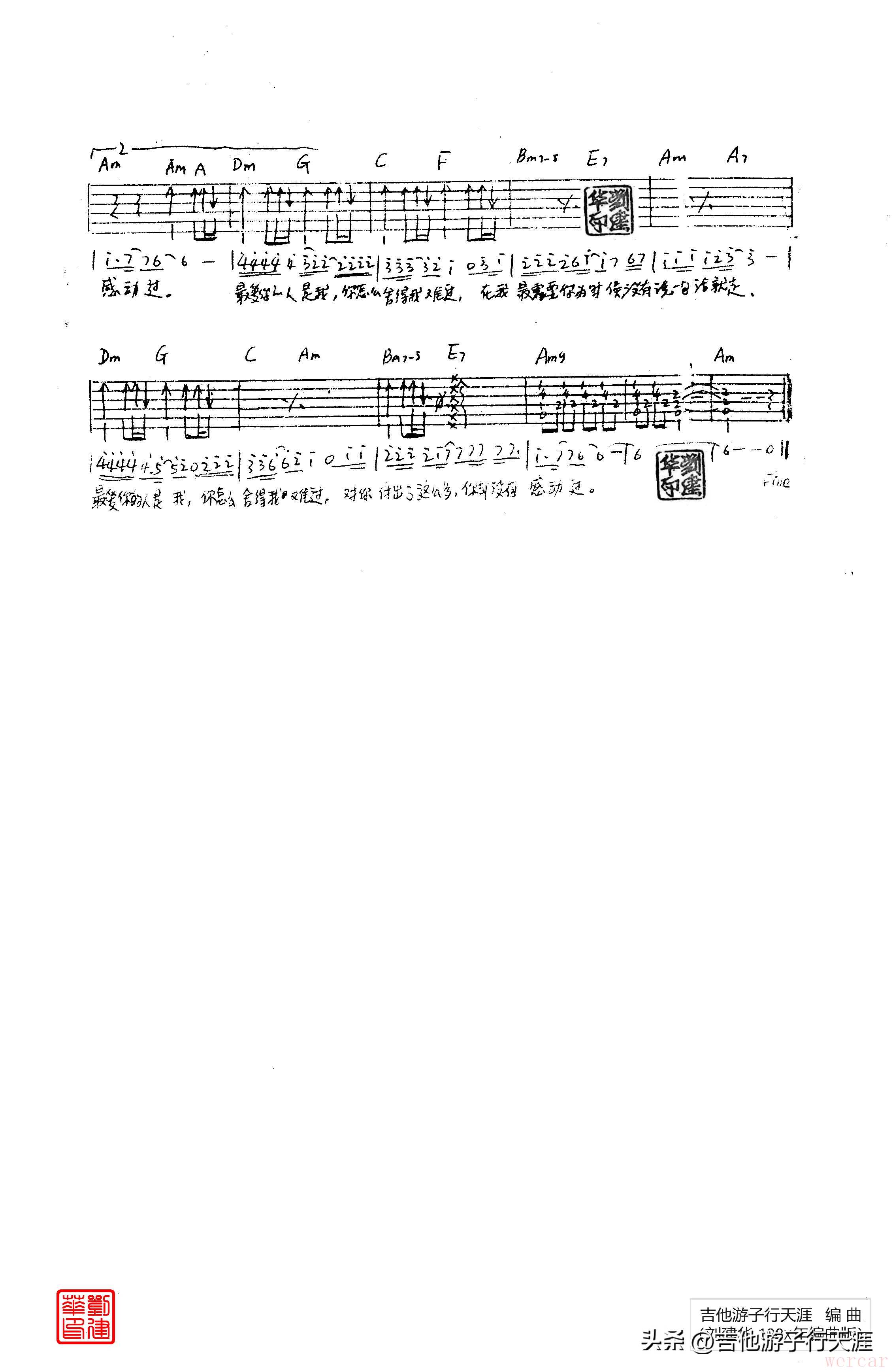 PS:以上曲谱是@吉他游子行天涯(刘建华)于上世纪80~90年代编曲的手写吉他弹唱曲谱集中的一首。30多年前游子的吉他弹唱编曲水平有限,大多数编曲都是初级难度的简单编曲,虽然简单但适合初学者演奏学习,这些手抄曲谱可能会有一些错误,游子也没修正,发布出来也只是对往日学吉他的一些纪念。