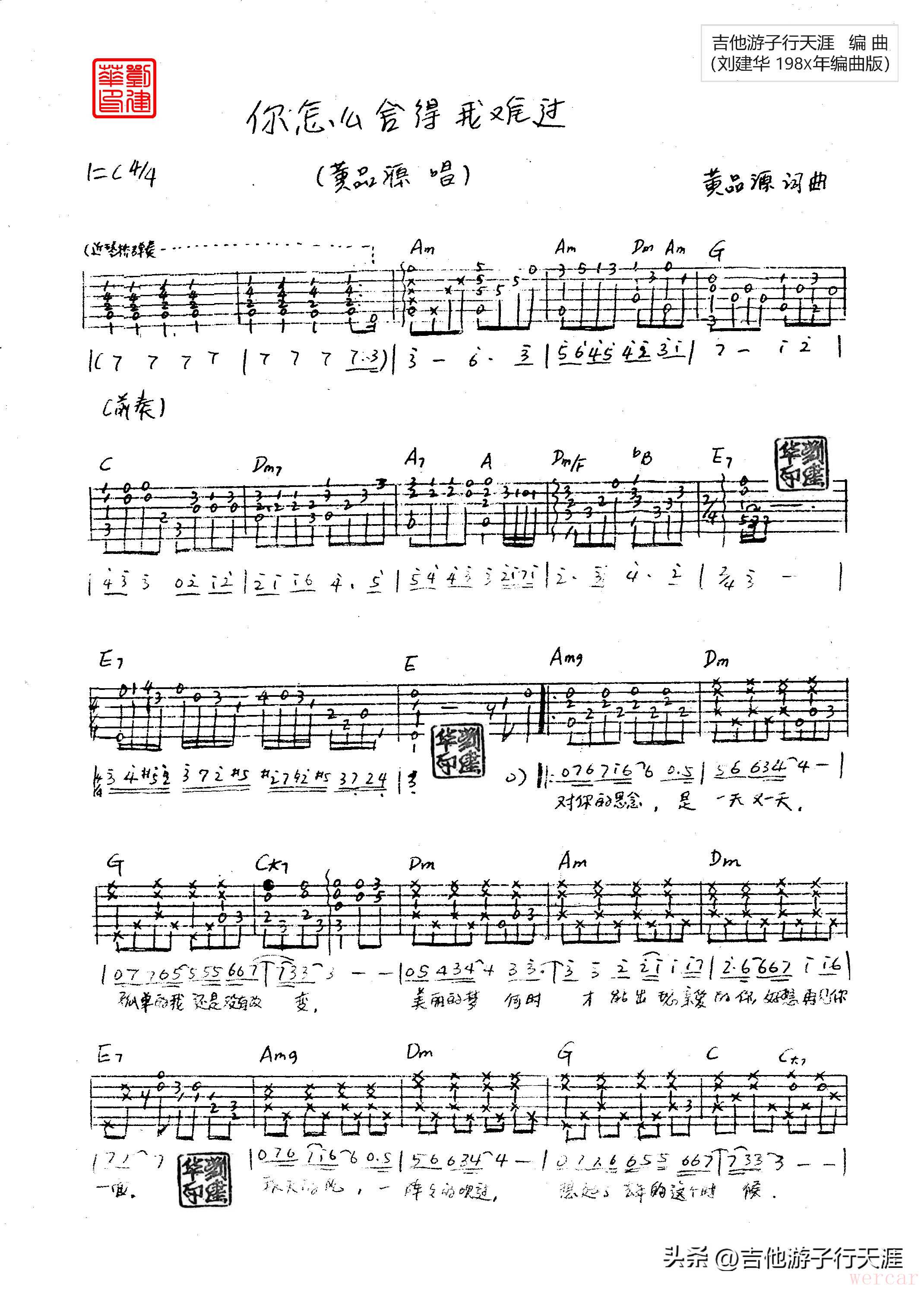 以下是一份游子的吉他弹唱手写谱:《你怎么舍得我难过》黄品源(刘建华 编)。