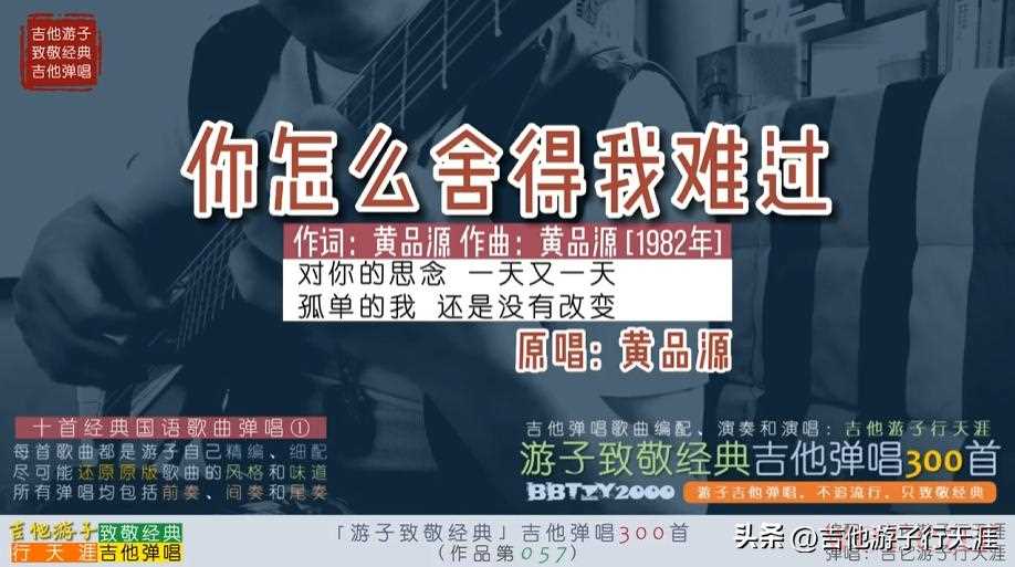 本吉他弹唱歌曲游子已重新编曲,收录于游子新编的「游子致敬经典吉他弹唱300首」合集中,示范弹唱视频链接如下:【观看链接】游子致敬经典:吉他弹唱黄品源《你怎么舍得我难过》十首国语歌①