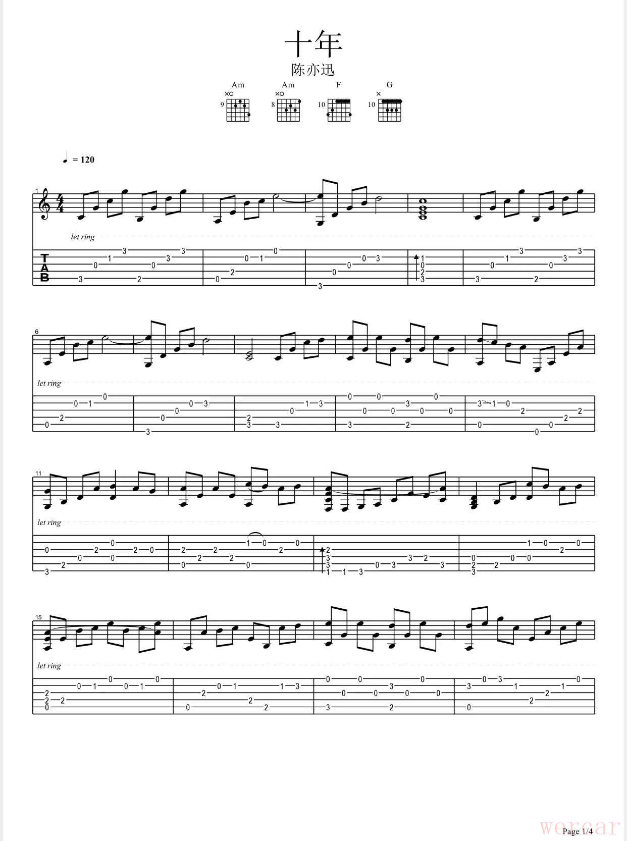 这首曲子怕是没有人没有听过吧!就算是你不听音乐,或者不喜欢他的歌曲,但你一定有的无的在不同场合听过吧!十年啊!我们有几个十年!十年可以成就多少事业、可以见证多少爱情啊!当然有可能正好相反!所以我们才会感叹!人生短短数十年!一瞬间就过了!有多少是我们拥有的,有多少是我们失去的、又有多少曾经放在我们面前没有珍惜的!现实生活中,真的没有所谓的在给我一个机会,我会对他她说:“我爱你,如果必须加上一个期限,我希望是一万年”!当然陈奕迅老师的经典歌曲太多了,后面有附!看看大家有几首听过,又有几首曾经打动过你的心扉!留言说说吧!当然我听的也不多,准备都听一下子!但他的那首《浮夸》是必须要听的啰!同样也是牛到不行!超级无敌震撼的编曲、穿透耳膜的人声!分分钟带你进入爱情的痛苦之中!哈哈哈!可惜可了!我还没有找到《浮夸》的指弹吉他谱!目前不能分享给朋友们哈!我在找找吧!但《十年》也是经典中的经典收藏曲目啰!同时指弹吉他谱已经找到,分享给大家吧!想想我的《十年》呢!哈哈哈!10年前好像什么都没有,没有事业、也没有爱情!20年前了好像也是如此!20多年前了?这个好像还真有,但不是事业!当然也不是爱情!而是情窦初开的隔斑同学,哈哈哈!你懂的!所以,我也准备写一首关于爱情故事的歌曲叫“《二十年前的故事》”!哈哈哈!敬请期待吧!嘿哈嚯!好吧!多的不说了!上谱吧!走你!《十年》指弹吉他谱: