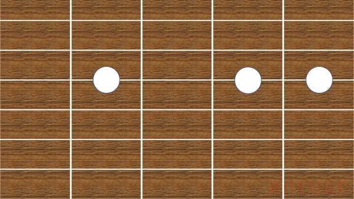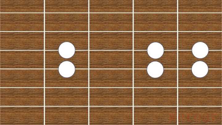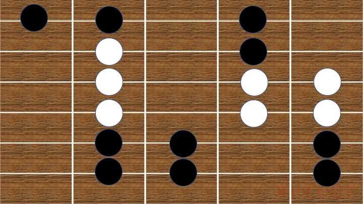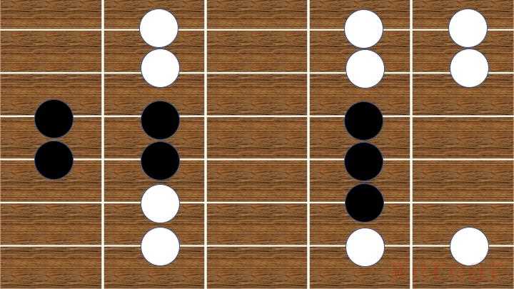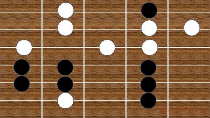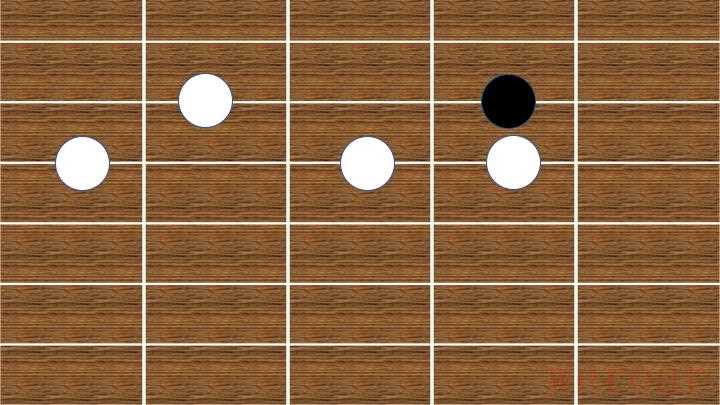 - 这一指法形状,仅应用于5、6两个音的弹奏,白色为5,黑色为6。口诀:1不动则2动。
