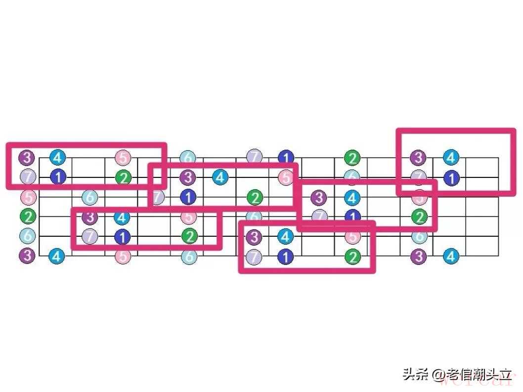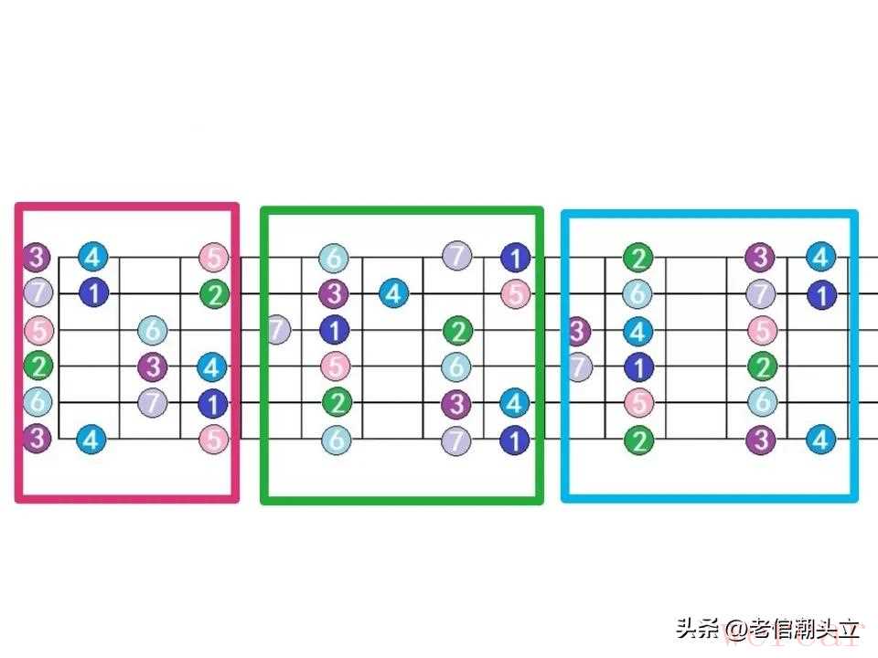 很多新手觉得“五种指型音阶”难,其实这五种指型,本质就是把上面3种基础指法拆拆合合。