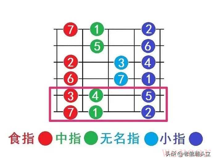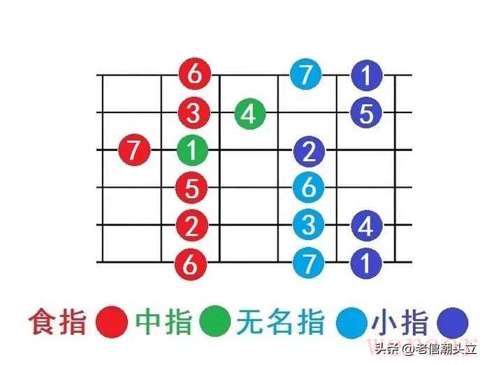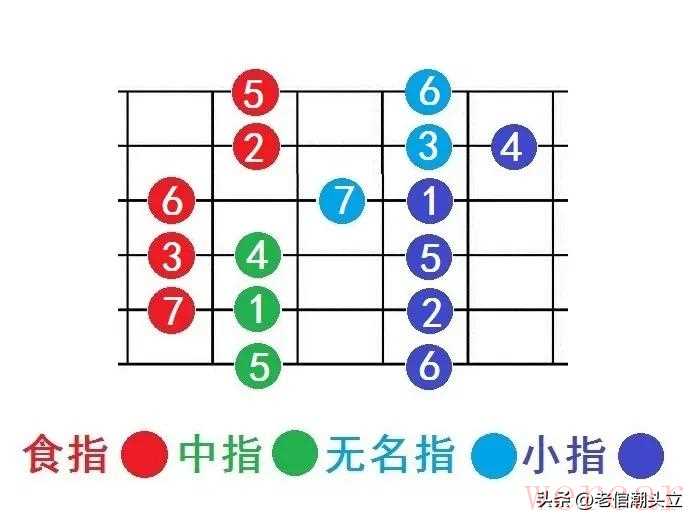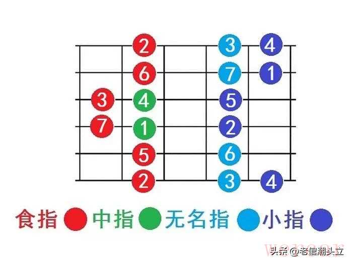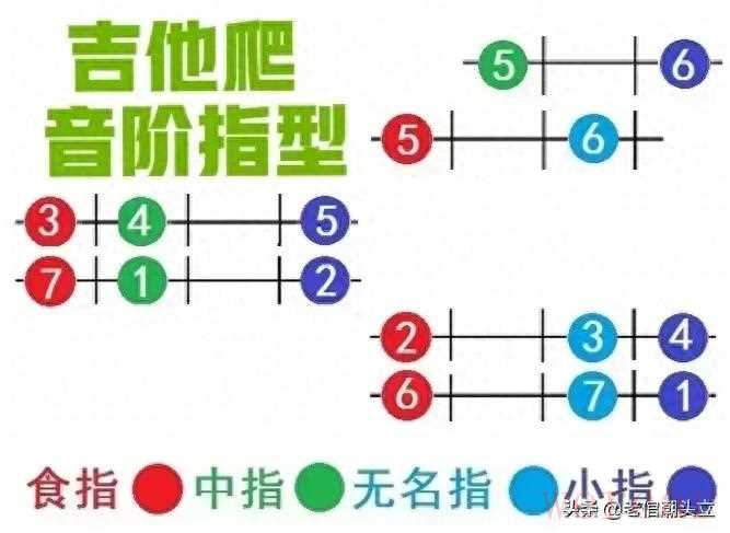 就像配图里的五种指型,前两种我已经标好了指法,大家可以试着自己标后面三种。只要你把“全音隔一品、半音相邻品”的规律和3种指型吃透,不用死记每个调的音阶位置,不管是C调、G调还是难一点的B调,在吉他1到12品甚至更高品,都能轻松找到对应的音,弹旋律、扒歌都不用慌!关于什么调,就看下面这张图,1哆落在那个音名上就是那个调。