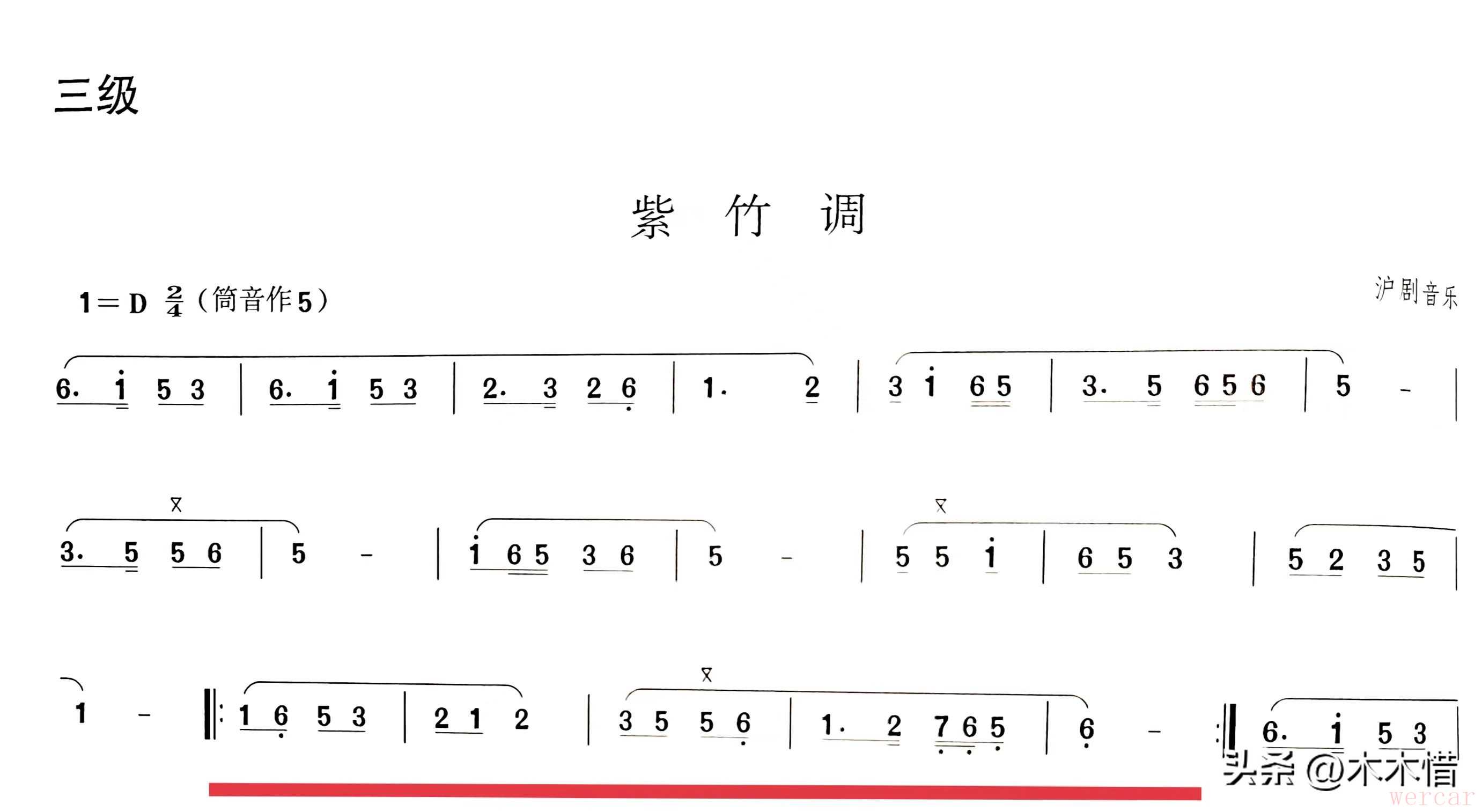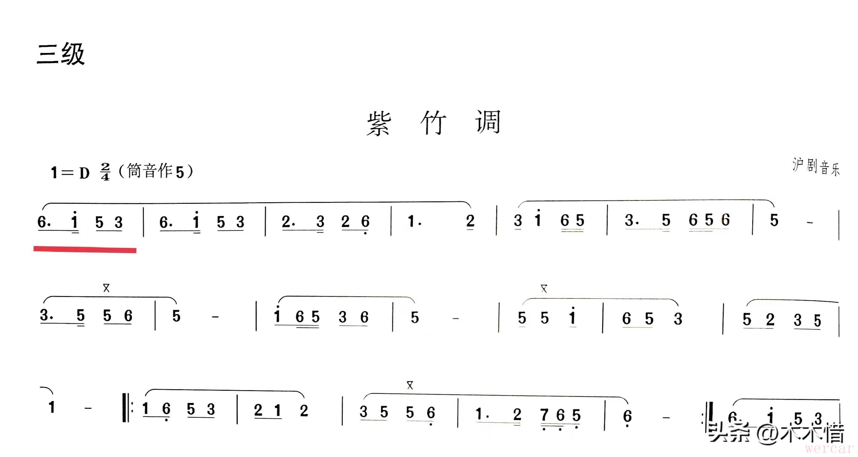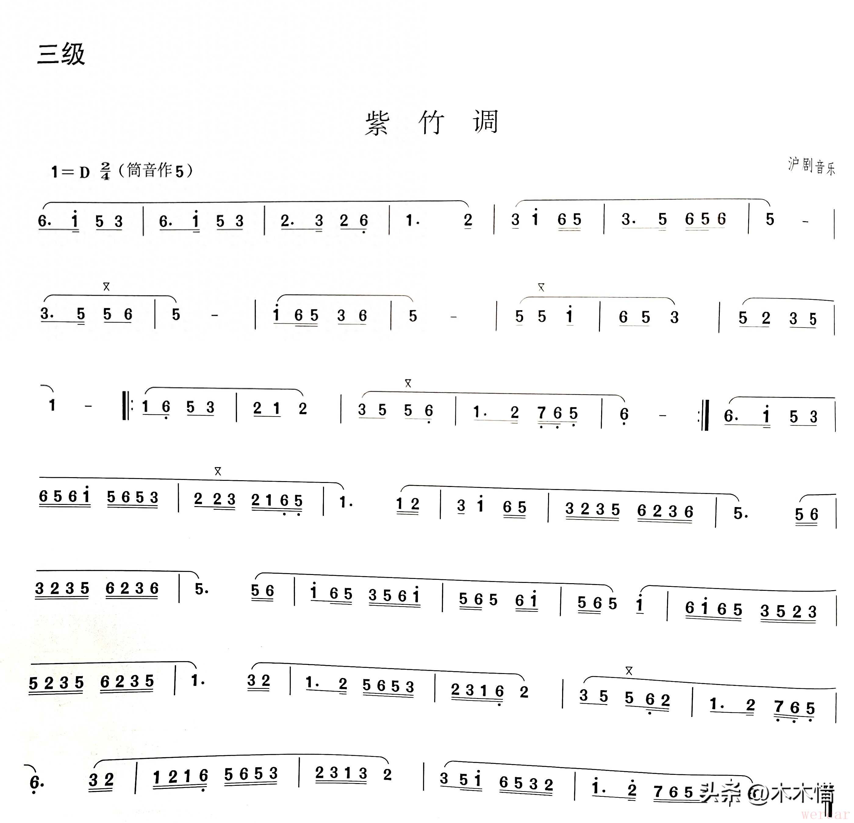 这是一份竹笛名曲《紫竹调》的简谱,也是竹笛考级三级的考试曲目。尽管《紫竹调》只是三级,但从难度上来说丝毫不比大部分古风曲流行曲低。