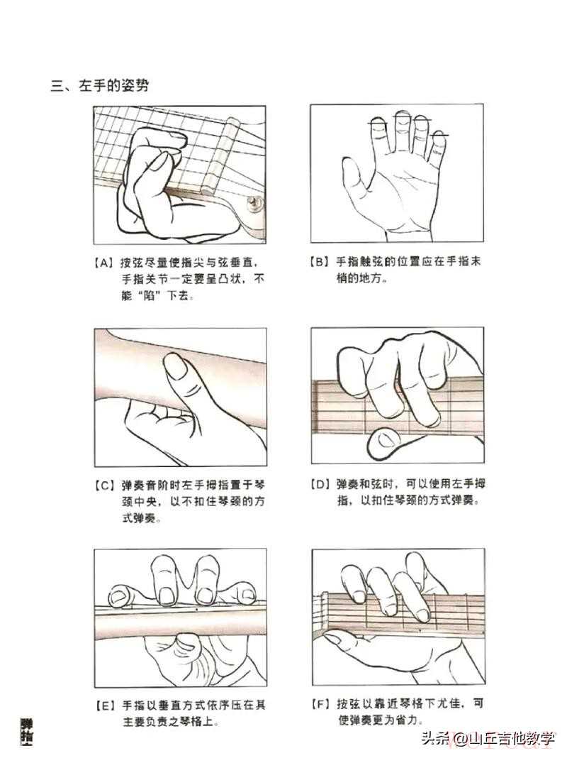 - 左手按弦: 练习用指尖按住琴弦,保证每个音都清晰,没有杂音。注意手指的姿势,指尖垂直于指板,尽量靠近品丝。