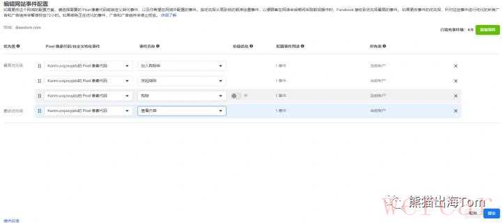 注意了,事件有优先级的。我们独立站卖货的卖家,优先级最高的是购买,放在第一行。之后的优先级依次是填写付款信息(我这么没有,你们可能有),发起结账,加入购物车,查看内容这些事件,就排在二三四五行。然后点击提交即可。本文来源熊猫出海Tom