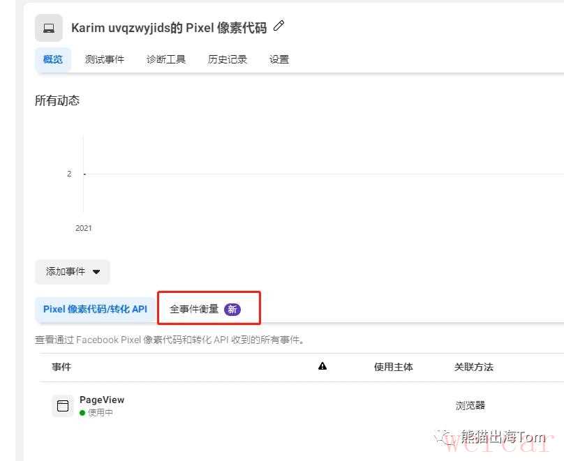 找到下方pixel像素代码/转化API,点击它右侧的全事件衡量