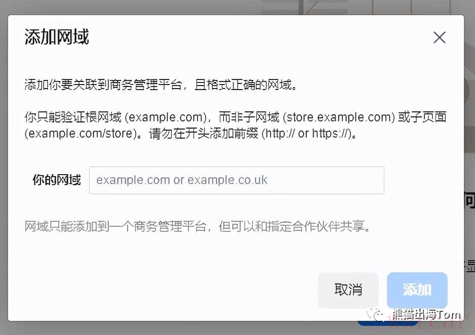 4)输入你店铺的独立域名,这个域名要和你这个BM绑定的广告账号绑定的域名一致。然后点添加网域