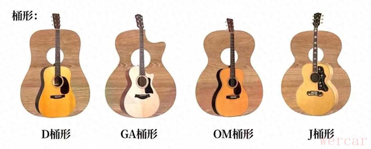 该桶形源自吉普森,标准尺寸42英寸,腰身细,桶身巨大,音量高,兼具了D桶形与A桶形的优点,适合各种风格。国内常称为珍宝捅。