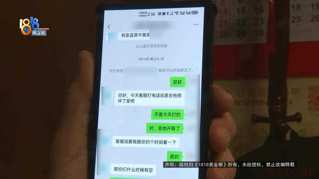 小丁怀疑是搬家师傅操作不当导致吉他受损事后他姐姐向“蓝犀牛搬家”全国客服投诉那位搬家师傅也上门来看过吉他并在微信中回复小丁的家人“这是一个硬盒子也不是什么易碎物品如果是要把里面磕破得多大力度的撞击我们全程是都是抱在手上的”记者用小丁的手机给这位搬家师傅打了微信电话