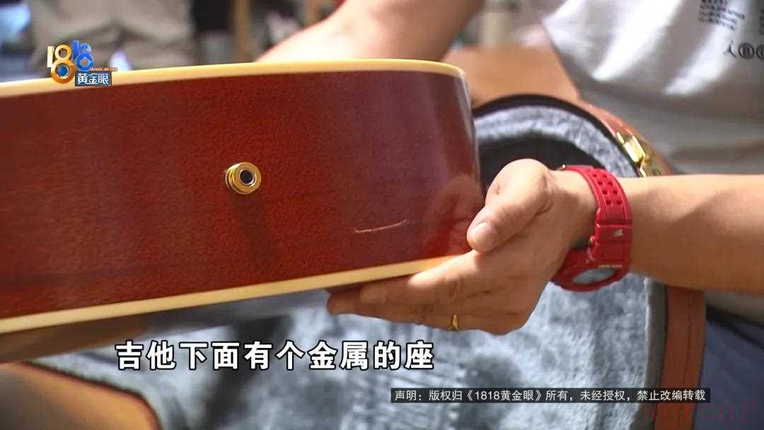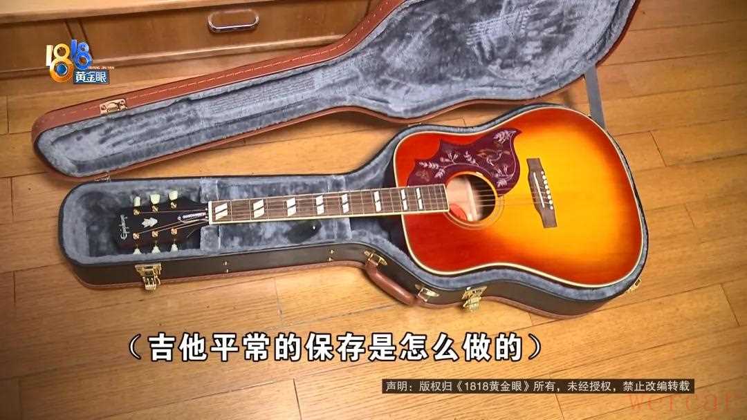 事前自己专门叮嘱家人要看好这把吉他记者注意到放置这把吉他的琴箱里有一层软垫琴箱上面还有好几个金属扣