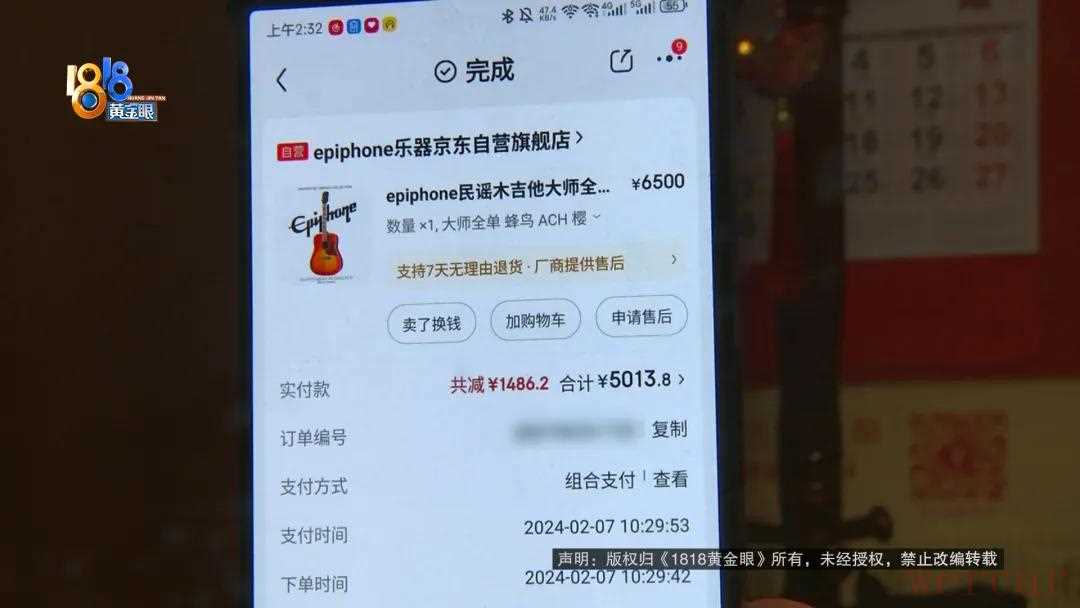 订单信息显示这把吉他是小丁2月7号在“京东”上一家乐器专营店买的实付金额是5013.8元