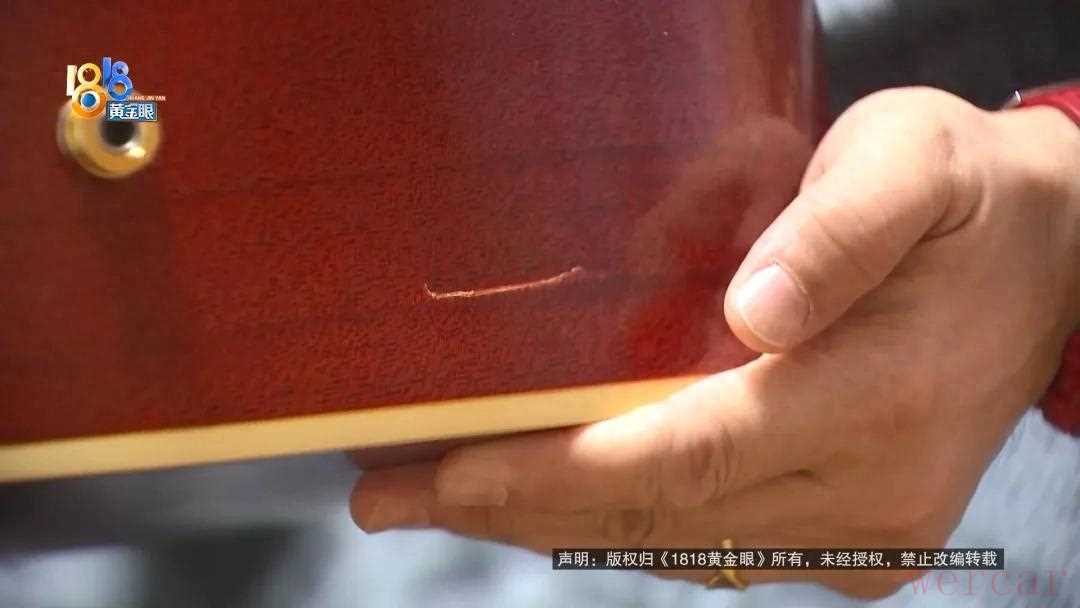 打开琴箱、拿起这把木吉他之后记者在吉他的琴身底部看到了一道裂痕长度大概有两三厘米琴箱的底部还有一处小磕碰但这处磕碰和吉他上那道裂痕的位置有一定偏差