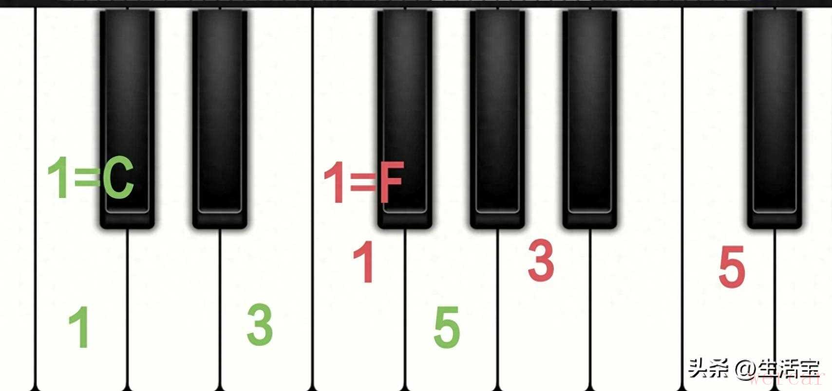 与C调类比,现在我们要弹奏F调,调号是1=F,也就是说,要弹奏音符1,只要弹奏F键就可以了。同样,这也恰好是现在要找的根音1,然后,再继续按照上面说的方法找到3音和5音,请参见图中用红色标记的和弦。