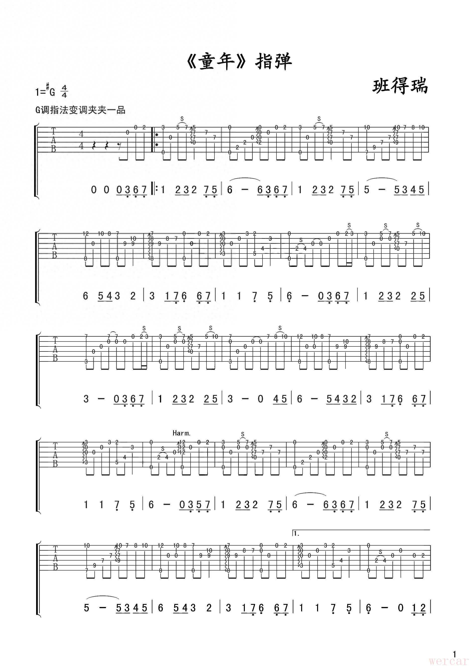 为你分享班得瑞《童年》的指弹吉他谱。