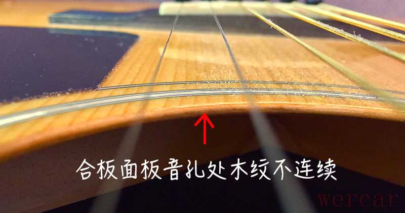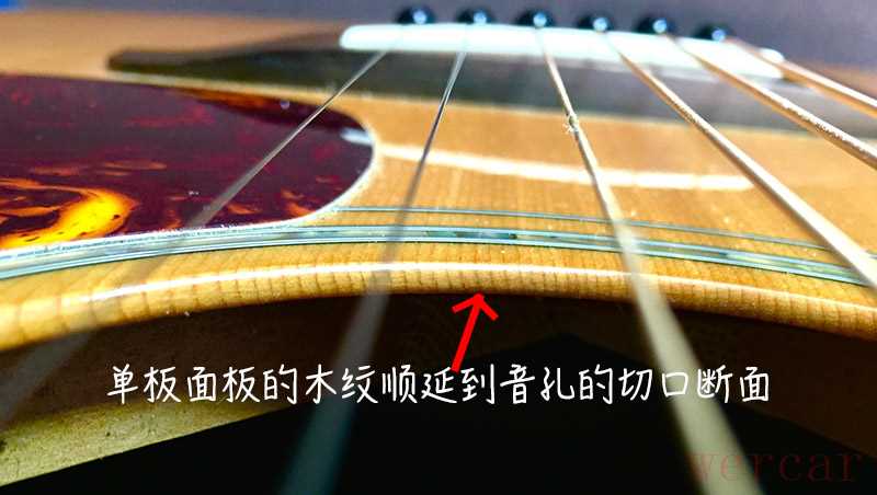 :“通常情况下,商家在出售单板吉他时都会将单板属性作为卖点告知消费者,当然,在你不清楚自己的吉他是否为单板时,你也可以通过观察来做出判断。1.面板是否为单板:观察面板音孔圈处的截面,单板面板的木纹延续至音孔内部,合板面板由人工压缩而成所以没有连续的木纹。