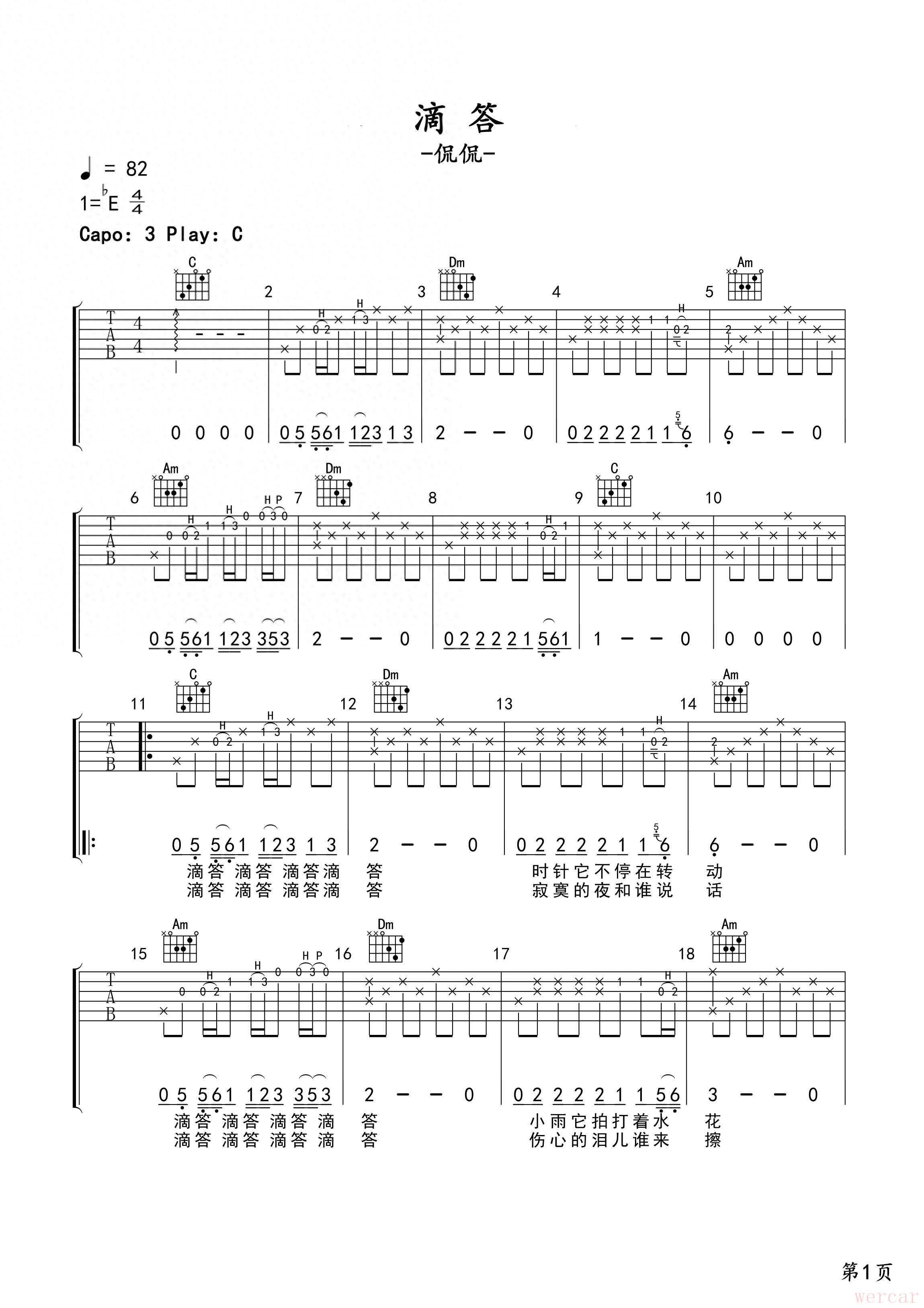 为您分享指弹吉他谱(通常指C调)的《滴答》。这首歌由胡彦斌演唱,旋律优美,节奏清晰,非常适合用指弹吉他演奏。