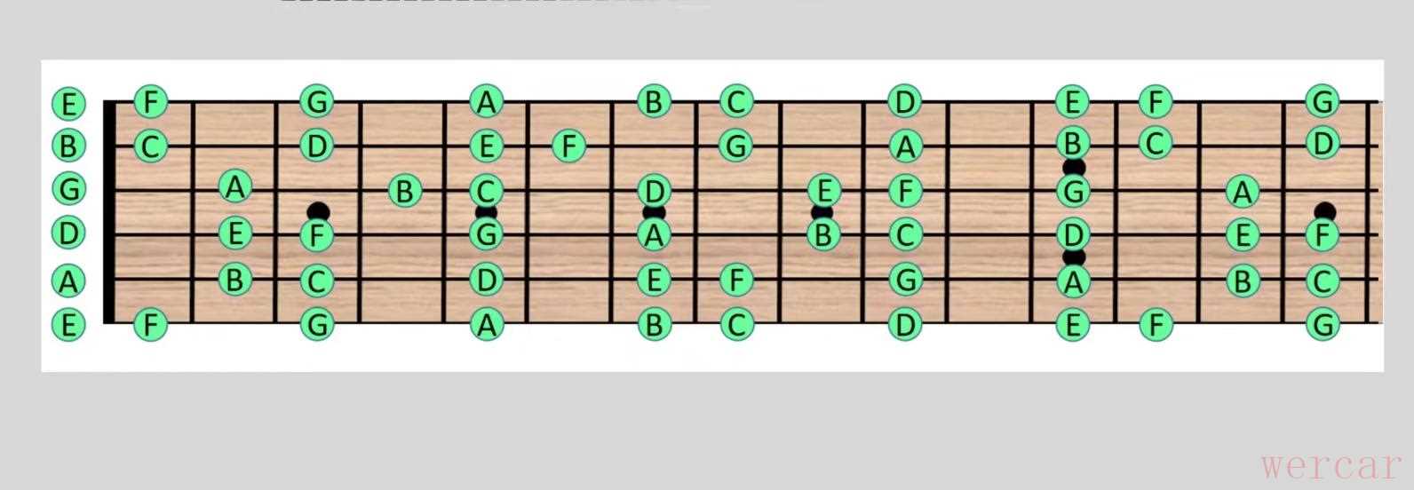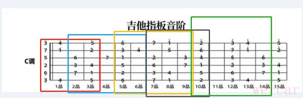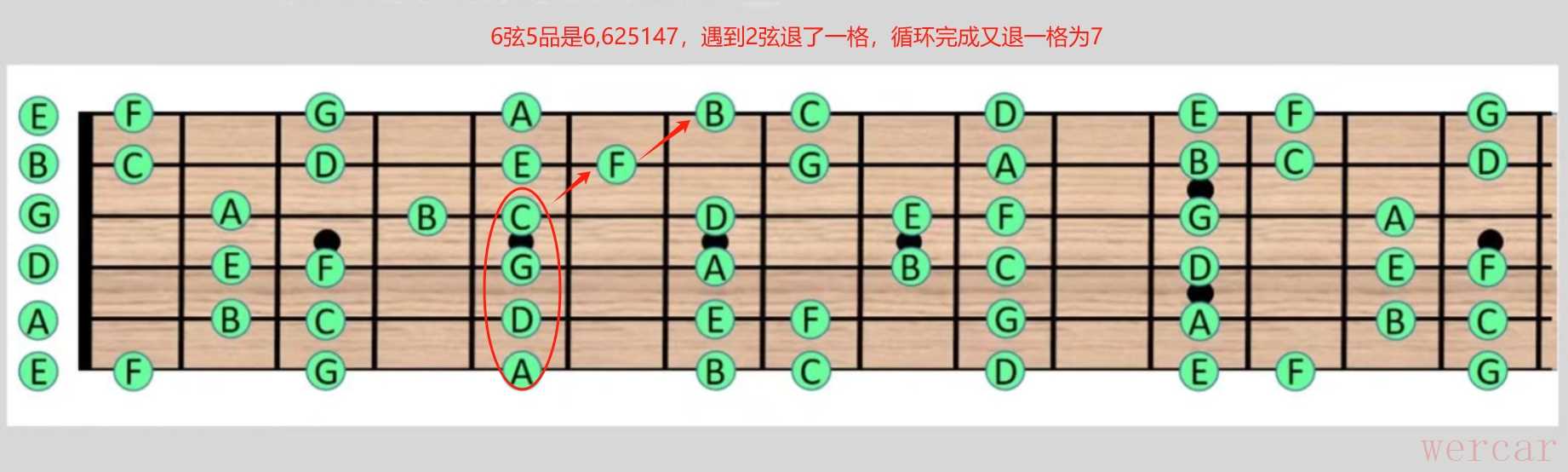 比如6弦的5品是6,6上面是不是2,2上面5, 5上面1, 1上面退一格4 ,当一个循环完成了,再退一格是不是7呢?其它弦大家自己去验证一下就明白了。