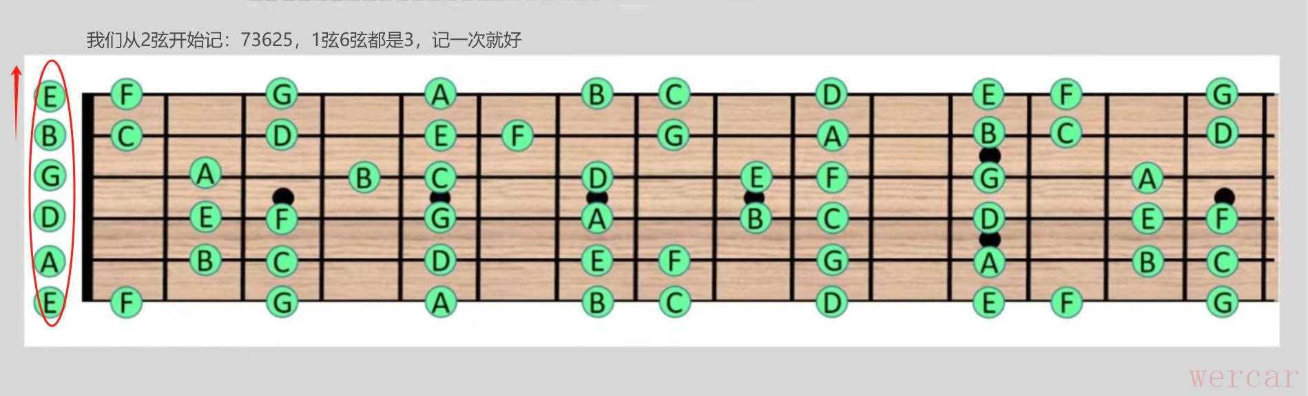教大家其实可以从2弦开始记空弦音,然后把1弦和6弦记一次就好,就变成了 : 73625,是不是瞬间就和五度圈逆时针匹配了,用大脑默想一下这几根琴弦,是不是这个排列顺序。少的1和4隐藏在7和3的下一个品格中。