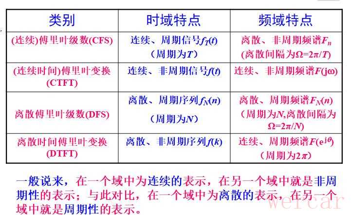 至于周期函数的傅里叶变换,其时域肯定是连续、周期的,其频域则是离散、非周期的;DFT则可以认为与DFS相同。