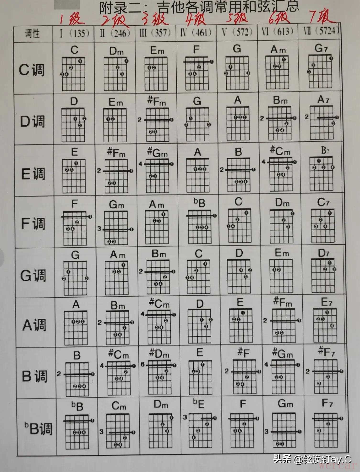 由此我们就可以用1级~7级七个数字,代表不同调式下的相应级别的和弦,再根据上图,我们就能知道具体是哪个。