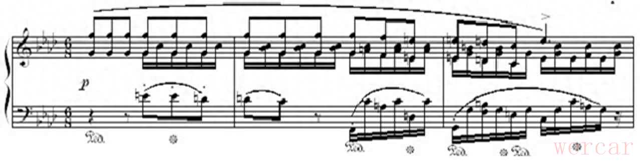 肖邦处在19 世纪浪漫主义时期,他的大部分作品都是以大小调系统为基础所创作。在《f小调第四叙事曲》中,肖邦多次使用和声大调的典型降六级音和和声小调典型升七级音。因为和声小调的第六级音和升高七级音所产生的增二度音程与和声大调的降低六级音和第七级音形成的增二度音程,会给听众带来相同的听觉感受。所以,当作曲家从大调过渡到小调时,他们可以运用此调式调性的典型特征来确保旋律的连接更加自然,模进的旋律更加规律,音乐调式调性的特征决定了音乐的整体发展,这种特殊的写作方式,让叙事曲特征更加明显,凸显了肖邦自由浪漫的风格。五、《f 小调第四叙事曲》的演奏技巧