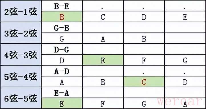 绿色代表半音,可以清楚看到3弦到2弦之间间距为四品,其他两个和弦间距为5品。