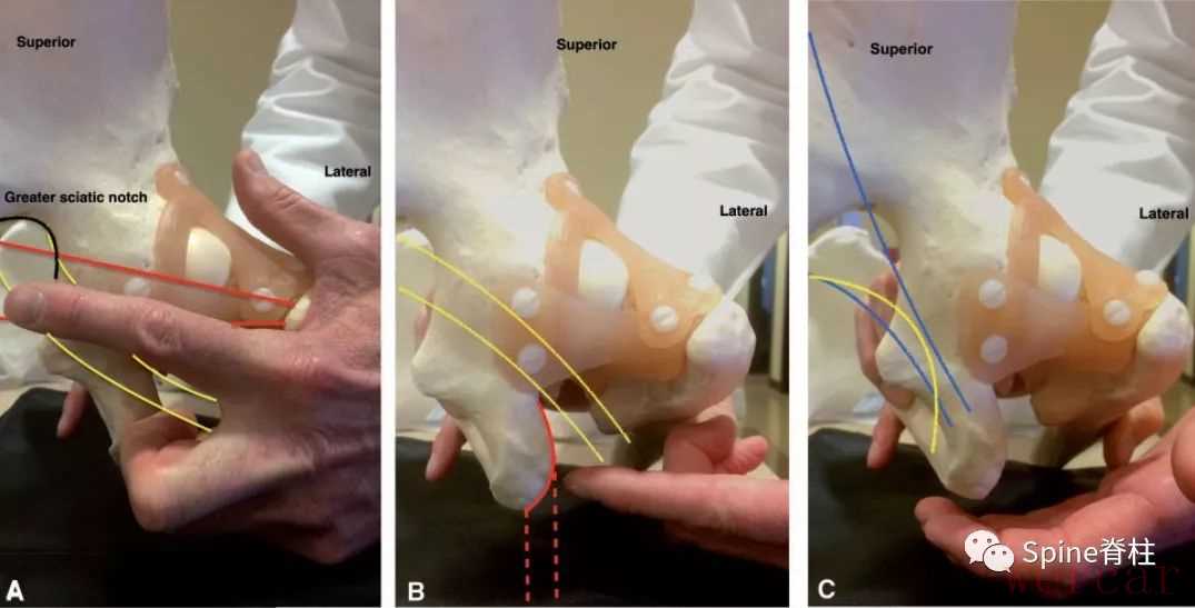 图示:触诊臀肌深间隙(A)坐骨大切迹(黑色轮廓)。梨状肌(以红色表示)和坐骨神经(以黄色表示)。(B)坐骨外侧(实心红线)。腘绳肌(红线)和坐骨神经(以黄色表示)。(C)坐骨内侧。骶结节韧带(以蓝色表示)和阴部神经(黄线)。