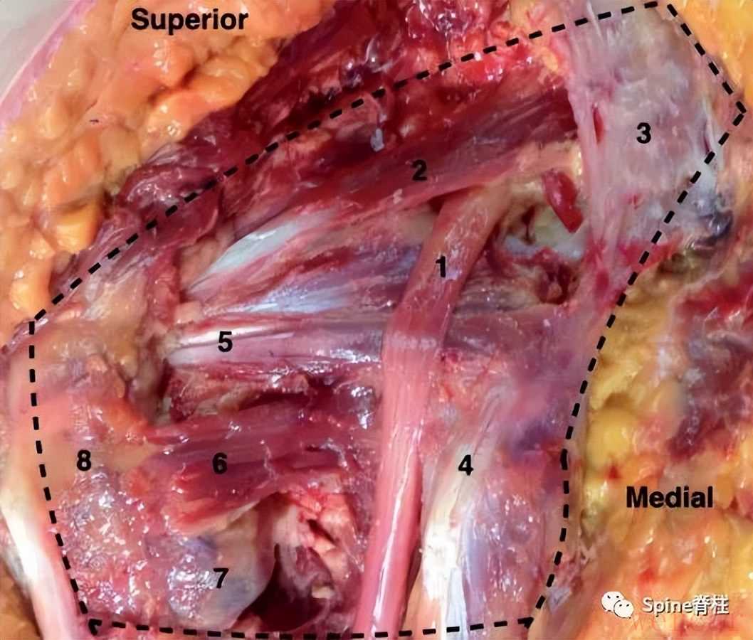 图示:臀深部区域尸体臀部的臀大肌被切除。1:坐骨神经,2:梨状肌,3:骶结节韧带,4:腘绳肌,5:闭孔内肌,6:股四头肌部分,7:小转子,8:大转子