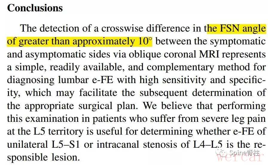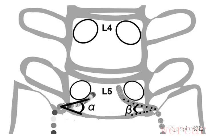 图示:L5脊神经的椎间孔角(FSN)。L5脊神经与L5下终板之间α和β角。椎间孔角应介于α和β角之间