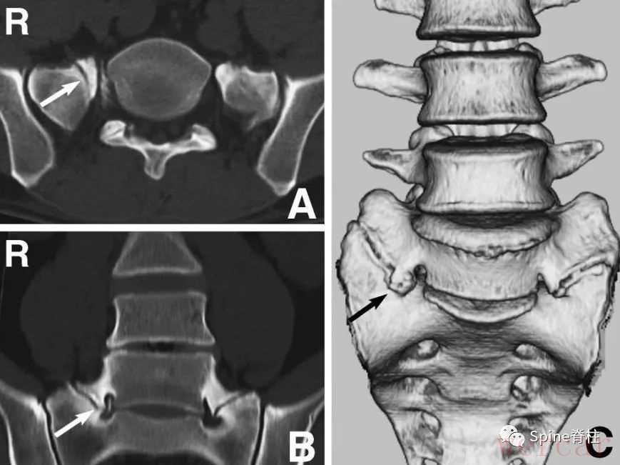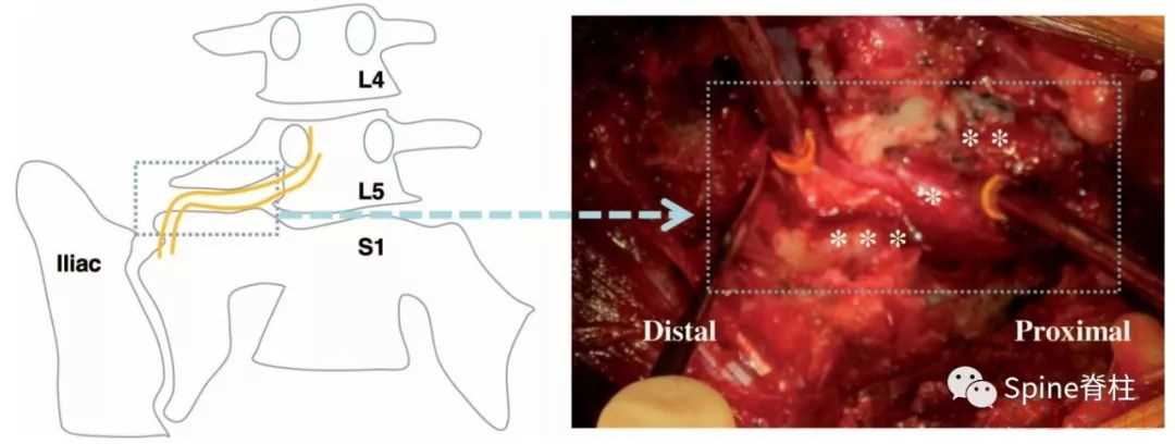 图示:确诊为 LSTV IIb型(具体分型详见:你注意过腰5椎体的横突吗?),患者L5神经根右下肢放射痛通过选择性根管造影确诊,增生肥大的横突与骶骨形成的假关节压迫椎间孔外侧远距离处的L5神经。