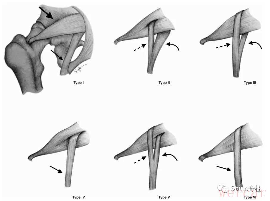 图示:梨状肌与坐骨神经关系的Beaton-Anson分型梨状肌(粗箭头)、坐骨神经(细箭头)、坐骨神经的腓总神经部分(虚箭头)和坐骨神经的胫神经部分(弯曲箭头)。据报道,1型最常见(84.2%),为正常型,2型次之(11.7%)为变异型,而其他变异型约占4.1%。