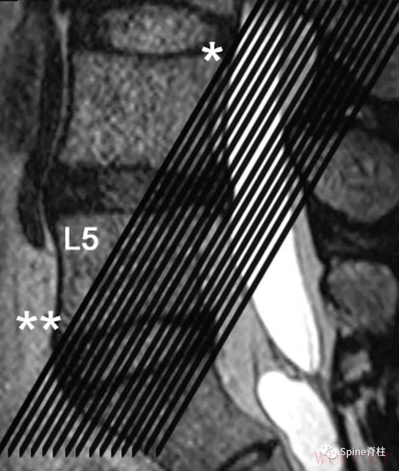 图示:通过T2加权像(T2WI)矢状位显示的斜冠状位T2WI切取的图像。黑线通过L4椎体的上后壁(*)和L5椎体的下前壁(**)。