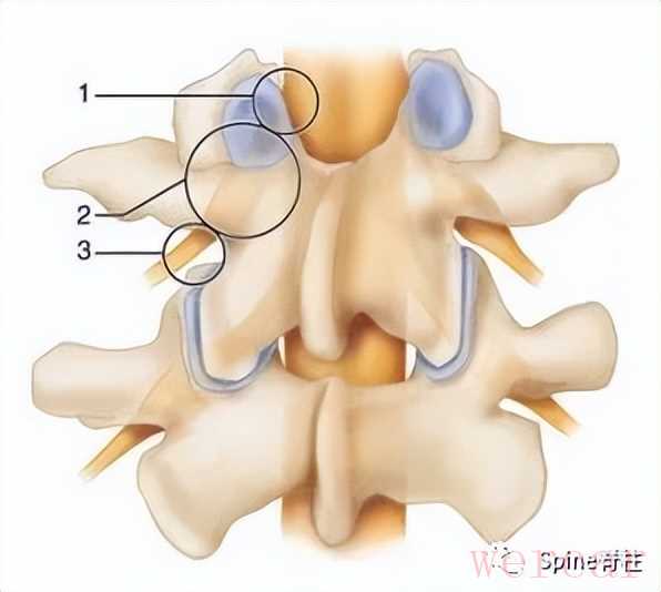 图示:1、2和3分别表示脊神经的入口处、走行处和出口处L5神经除了在入口根、走行根或出口根处受椎间盘影响外,也可在远离椎间孔区域,受L5椎体侧缘骨赘压迫,或在L5肥大的横突与骶翼之间受压迫,引起典型的L5脊神经根病(L5 radiculopathy),从而出现与腰椎间盘突出症相似的下肢放射痛,也有学者称之为远端综合征(Far-out syndrome)或症状性腰骶移行椎(Symptomatic LSTV),又称为Bertolotti 综合征。