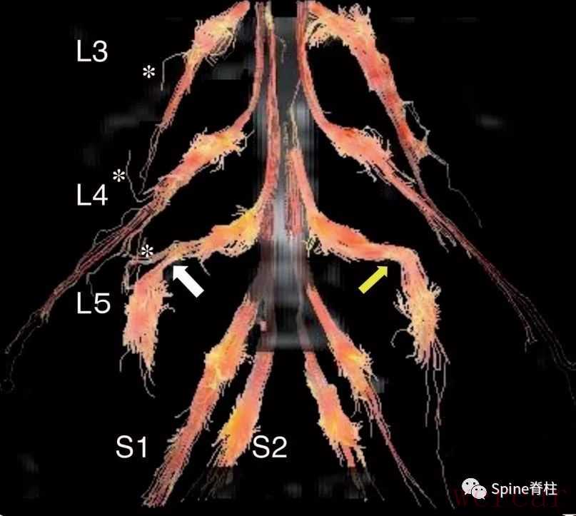 - 右侧图:在正常人组中,显示的右侧(白箭头)和左侧(黑箭头)L5脊神经。