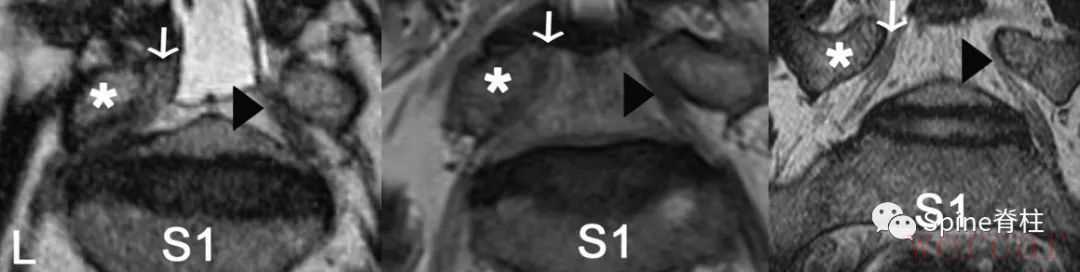 图示:术中证实,右侧L5脊神经(*)在L5横突(**)和骶骨翼(***)之间被压迫。第三种:椎间孔角(FSA)在斜冠状位T2加权的成像(OC-T2WI)