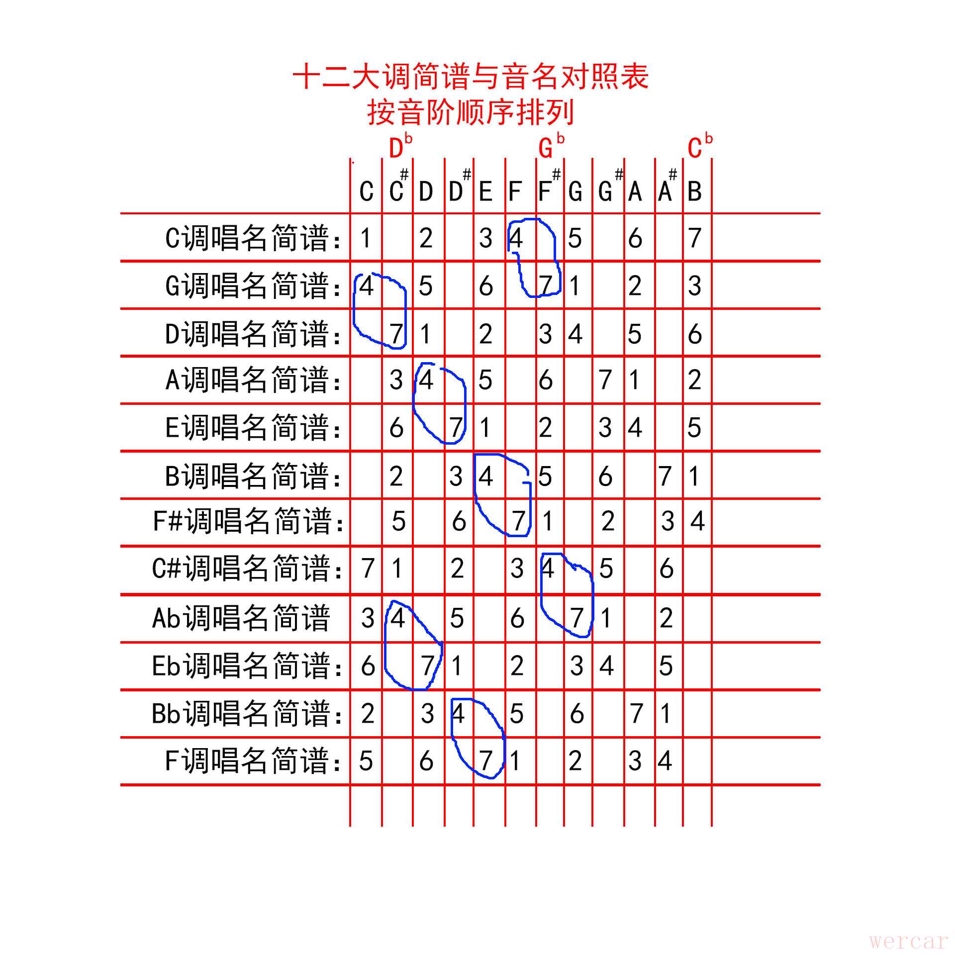 3、十二大调简谱按升号降号排列成汇总图