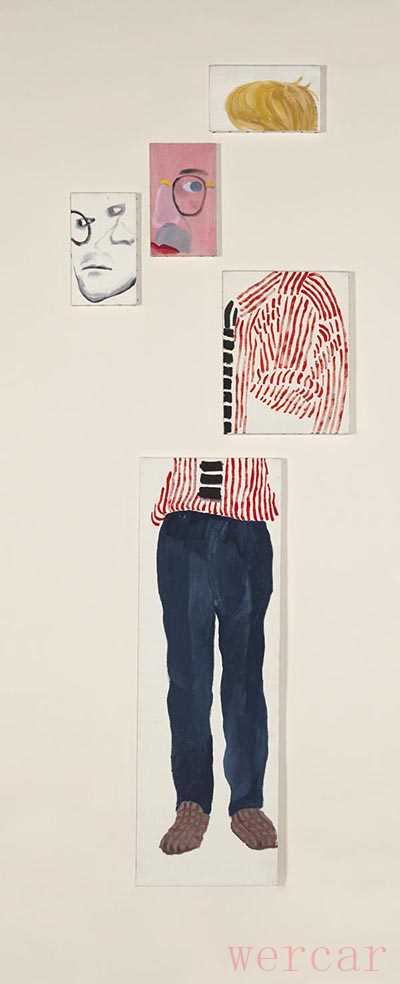 其中尤其值得一提的是一张创作于1954年的自画像,画面中17岁的霍克尼正在布拉德福德艺术学院学习,留着黑发和西瓜皮发型、粗框的眼镜、蓝外套、灰白相间的衬衫、垂直条纹的绿裤子……而这一切皆由不同颜色的媒材剪贴而成,透露出另类的流行趋势。当时许多现代艺术家倾向用报纸、广告、插图等唾手可得的媒材制作艺术品,年轻的霍克尼自然加入热潮之中。