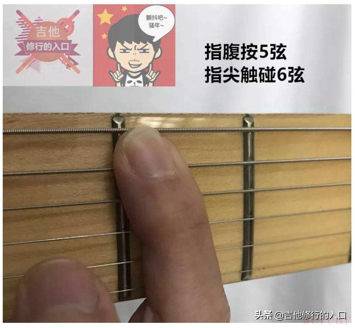 而在失真音色下,多数情况下弹电吉他则与之相反,我们需要做到弹琴干净,不该发出声音的琴弦则需要靠左右手的配合去闷住它。对此,电吉他的新手们通过这节的练习需要左手食指养成一个习惯——用指腹按弦,指尖的肉用来触碰上一根弦。如下方图片所示。