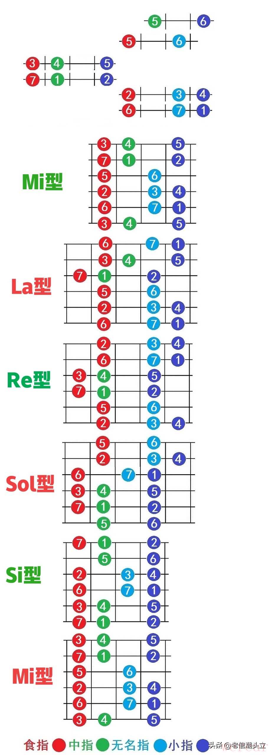 等这3个指型的爬格子练到熟练不卡壳,就可以按“Mi型→Si型→Sol型→Re型→La型”的顺序进阶。重点来了,掌握五种指型不用逐个死记:先把Mi型练透,保持指法不变,向1弦方向横移1弦,就能形成新指型,重复横移5次,五种指型直接拿下。