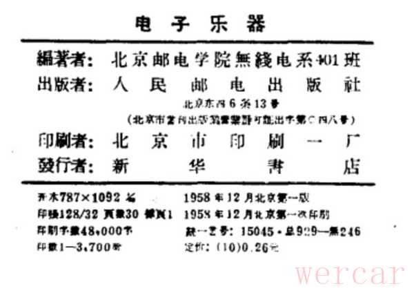 我没找到文中提及的那份物证,却查到了同为一九五八年出版的专著《电子乐器》,薄薄一册,只印了三千七百本,作者是“北京邮电学院无线电系401班”,人民邮电出版社印行。答案偏向了首都北京。如果我们查阅百度百科的电子琴页面,其中一句也在旁证:“在中国,1958年北京邮电学院研制了一台电子管单音电子琴。”