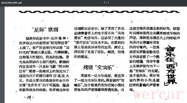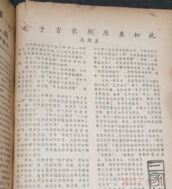 还是依托乐剧。一九六一年的《前线》杂志(第二十四期,P21)登载文章《“电子音乐剧”原来如此》。作者吴南星从《巴西时报》编译了一些素材,点明剧中的电子音乐都是在意大利的一个实验室录制的,他夹叙夹议,语带批判:“我连想到不久以前听说的美国‘无声音乐’。那种音乐在演奏的时候,比起这种‘电子音乐’还要省事得多。演奏‘无声音乐’的人,有时只要在自己面前摆上几颗绿豆,凝视十分钟就完事了……现代西方资产阶级的艺术,是腐朽的没落的艺术。”这是在黑“乐坛发明家”约翰·凯奇(John Cage)啊!