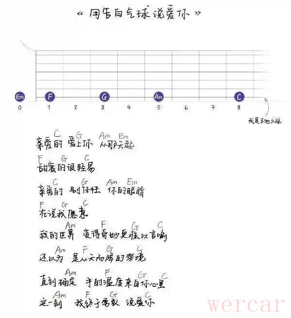 看完视频是不是觉得很好玩?接下来就给各位简单介绍下玩法。下面两张图就是小妹为大家准备的曲谱。一张为和弦图,而一张是单纯的“吉他品”图。